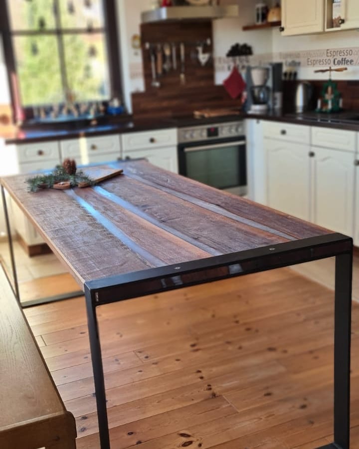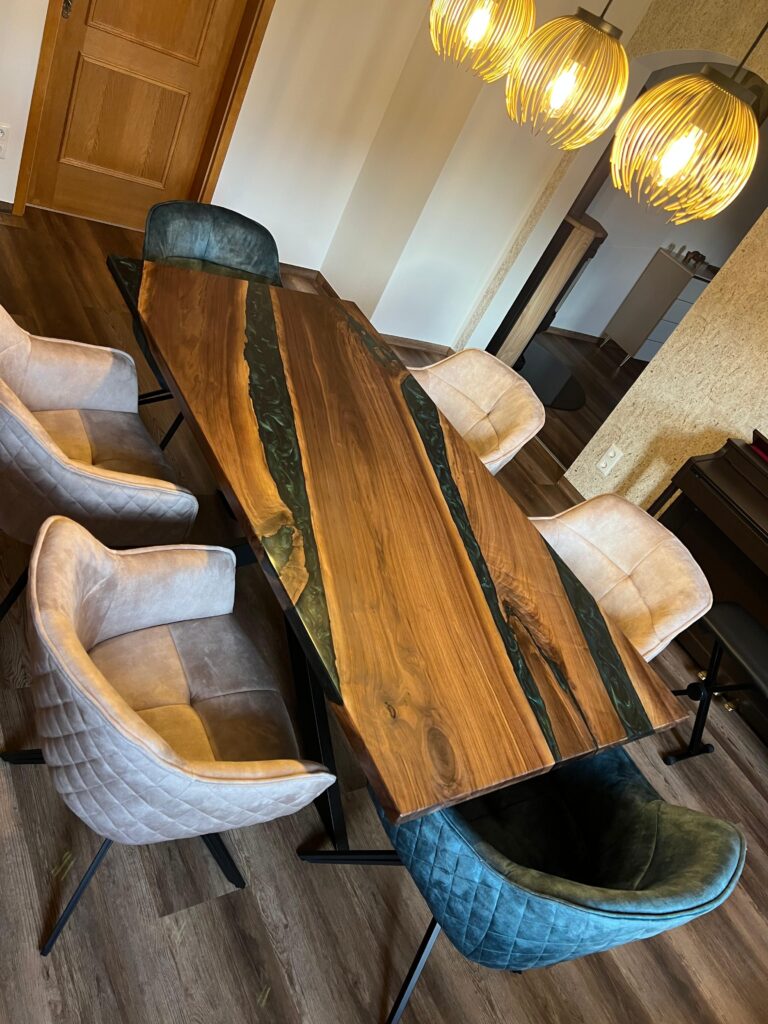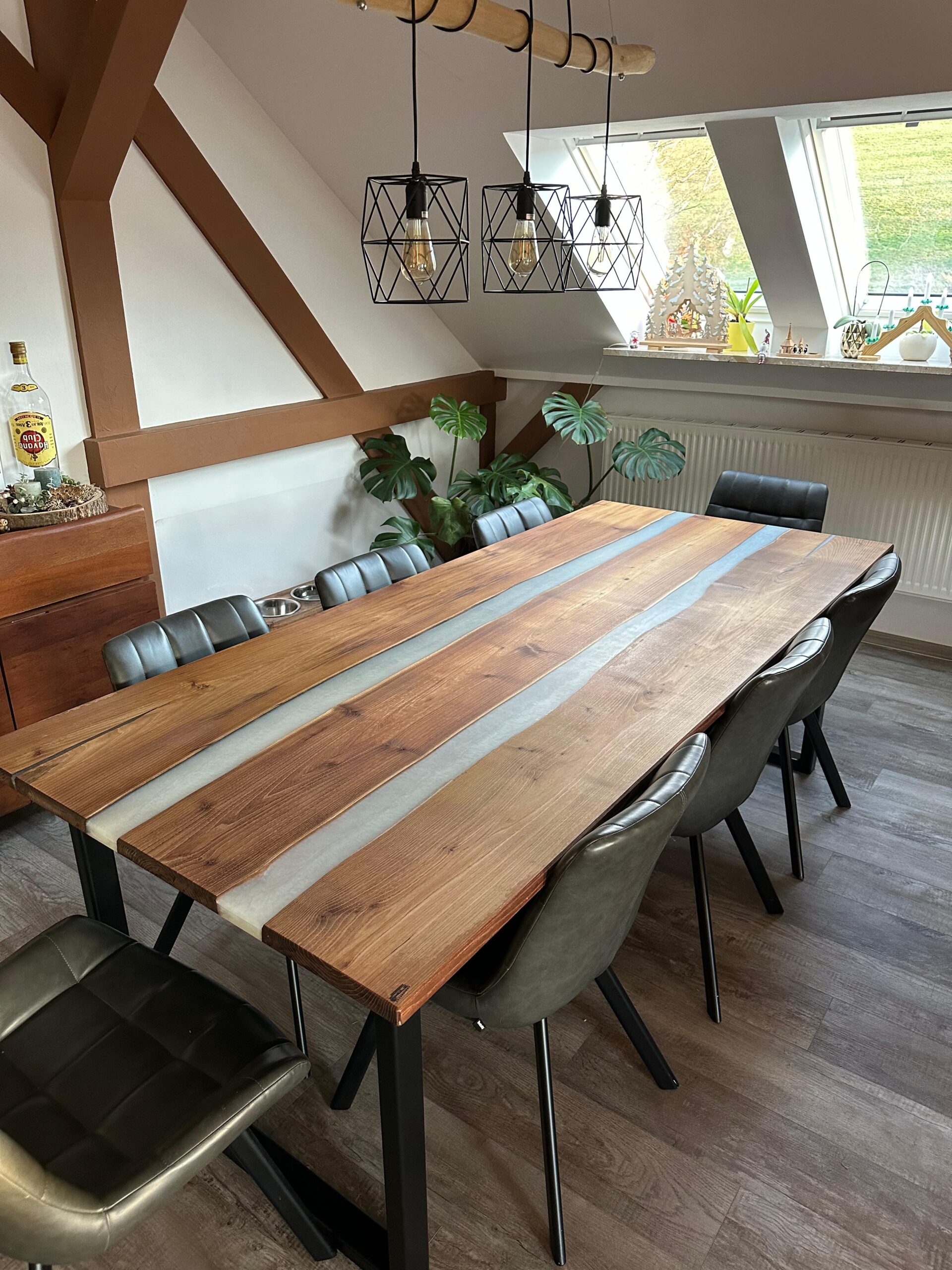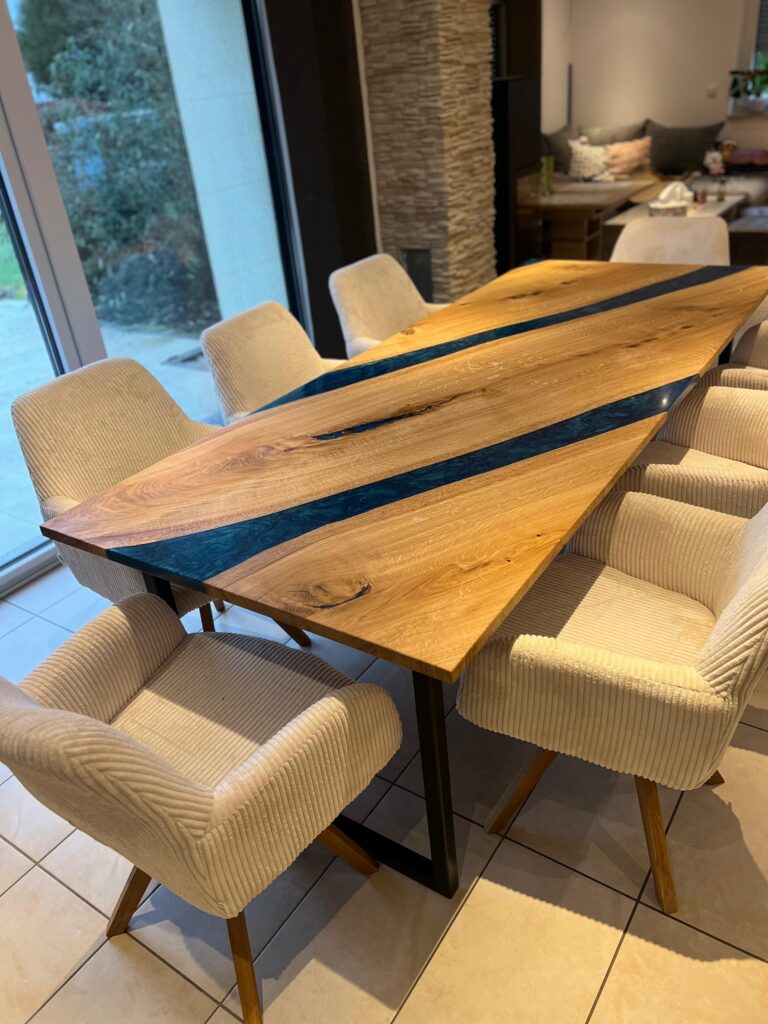 Wir fertigen individuelle Tischplatten die Funktion und Design vereinen. Ob klassisch mit Vollholz oder auffallend mit farbigem Epoxidharz.